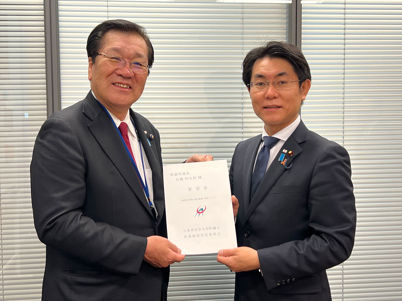 要望活動 国道法面補修工事の財政支援の要望を国土交通省へ 2022.02.15 要望活動 国土交通省を訪れ、斉藤鉄夫大臣に安芸太田町内の一般国道186号・191号・433号の法面補修工事等の道路防災事業に対する財政支援を要望しました。 石橋林太郎衆議院議員にも同じ要望を行いました。 国土交通大臣へ国道186・191・433重点整備の要望…前の記事 4月の国土交通大臣要望書提出の際、農林水産省の研修を …次の記事