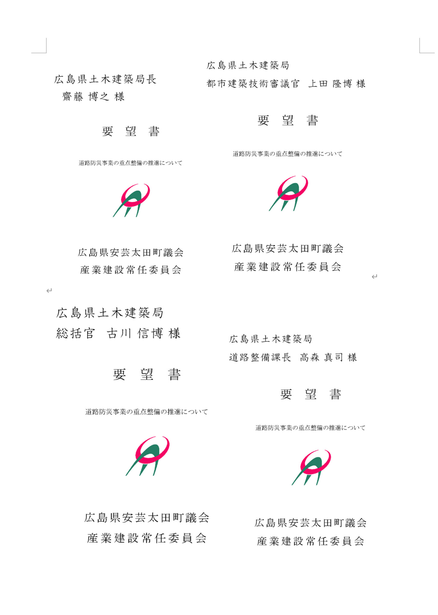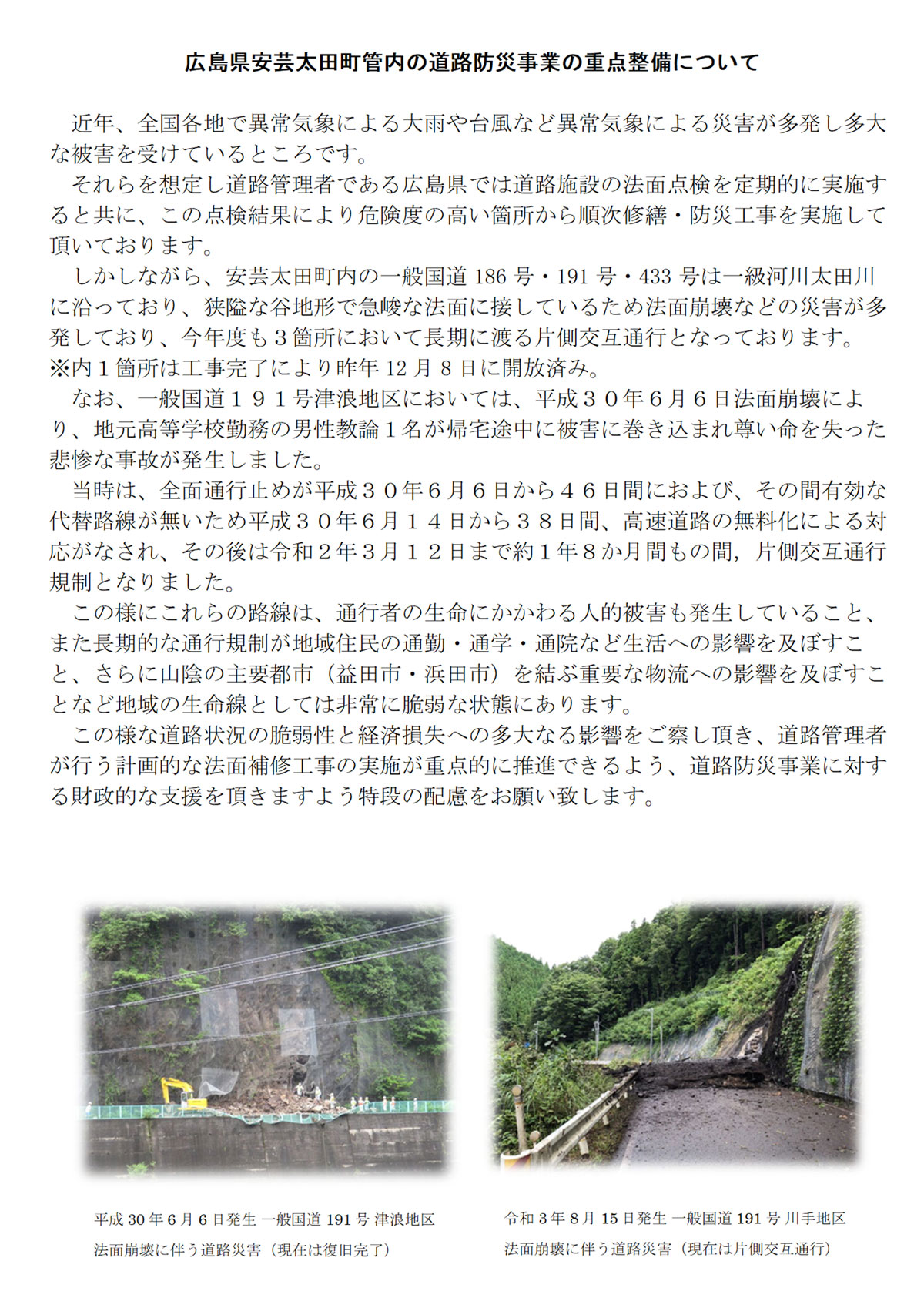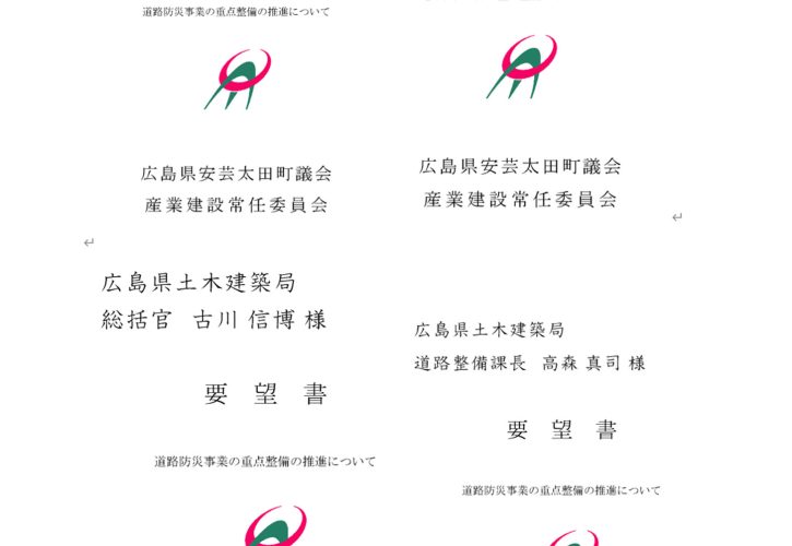 要望活動 広島県安芸太田町管内の道路防災事業の重点整備要望 2025.02.20 要望活動 令和4年2月9日、広島県土木建築局の、狭戸尾県議と建設局長、統括官、都市建築技術審議官、道路整備課長を訪ね、広島県安芸太田町管内の道路防災事業の重点整備を要望しました。 旧JR可部線河川橋梁撤去に係る要望前の記事 自治消防(消防団)の現状を説明し、支援を要請次の記事