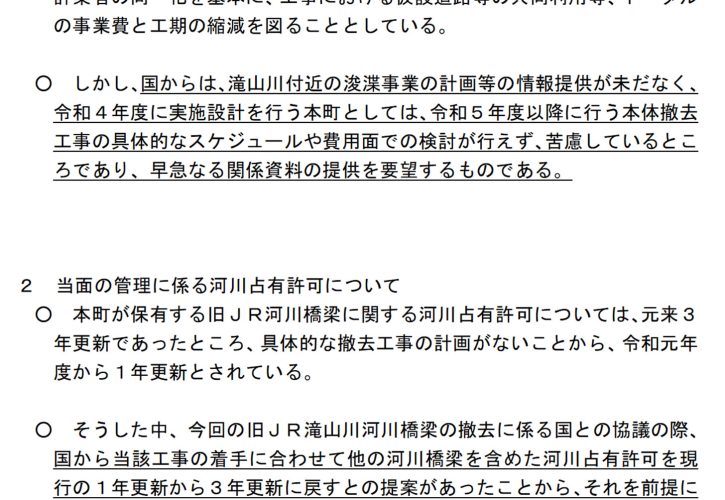 - そうした中、今回の旧JR滝山川河川橋梁の撤去に係る国との協議の際、国から当該工事の着手に合わせて他の河川橋梁を含めた河川占有許可を現行の1年更新から3年更新に戻すとの提案があったことから、それを前提に本町として数億円を超える撤去工事に着手している。一方、現在の河川占有許可期限が令和4年3月末となっており、早急なる更新手続きを行う必要があり、本町から数度となく問い合わせるも、国は検討中との回答に終始されており、事務手続きに入れない状況であり、早急なる更新見直しの回答を要望するものである。