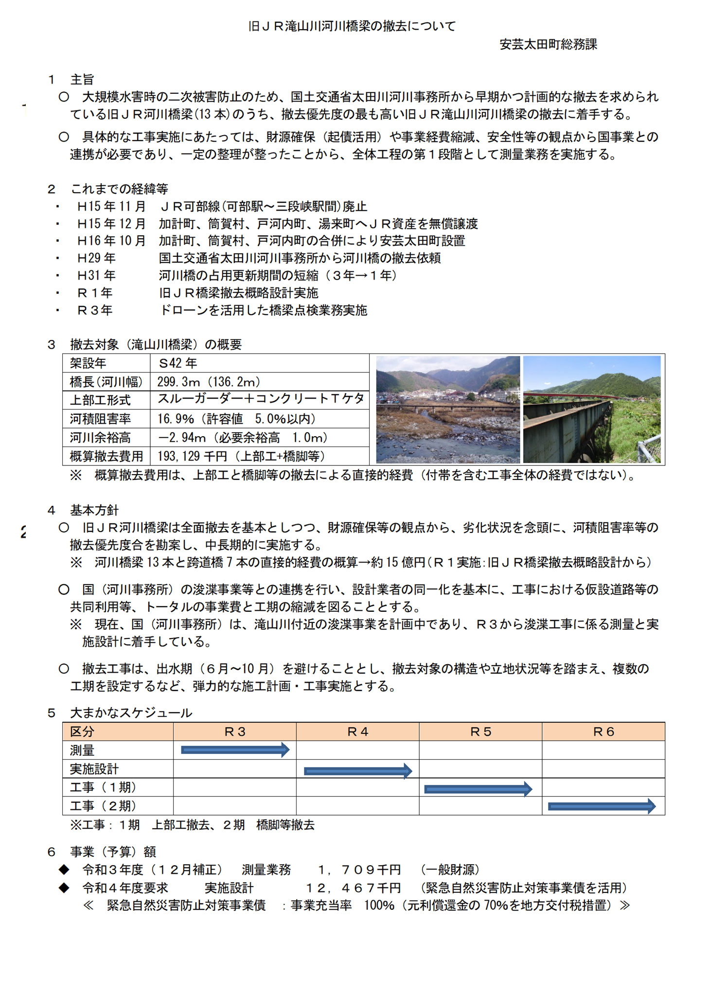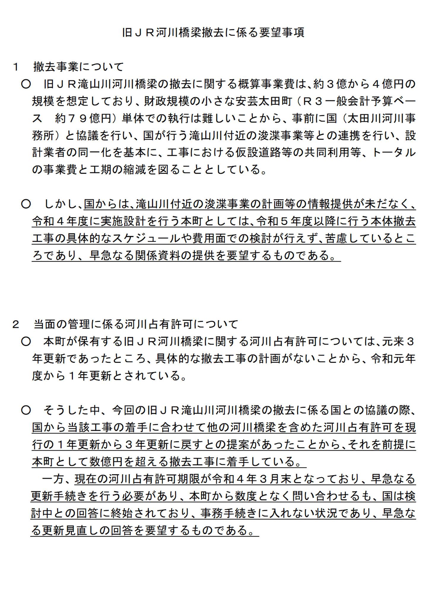 要望活動 旧JR可部線河川橋梁撤去に係る要望 2025.02.20 要望活動 令和4年1月11日、宮沢洋一参議院議員と斉藤鉄夫事務所に、旧JR河川橋梁撤去に係る要望、続いて斉藤事務所で、4月の国土交通大臣訪問の打ち合わせを行いました。 黎明館の運営状況前の記事 広島県安芸太田町管内の道路防災事業の重点整備要望次の記事